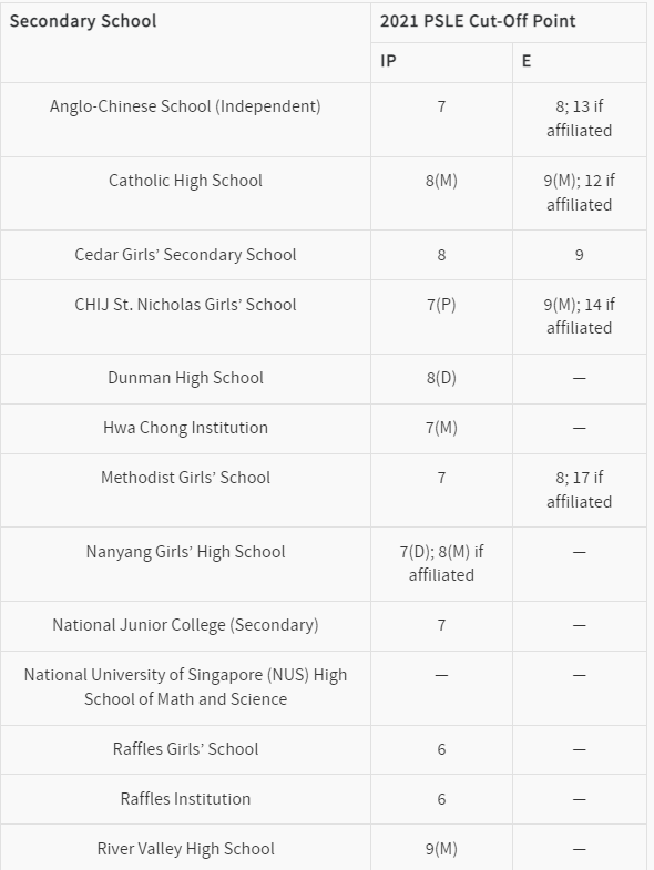 IP Schools List Secondary School2021 PSLE Cut-Off Point