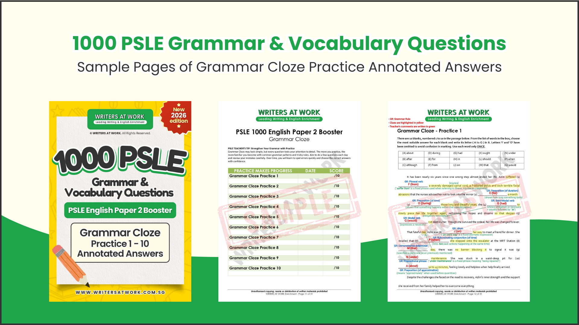 Developed using exam-style questions from Singapore’s top schools and refined by W@W English Specialists, this ebook provides structured practices across key English Paper 2 components — Grammar MCQs, Vocabulary MCQs & Vocabulary Cloze MCQs, Grammar Cloze, Comprehension Cloze, and Synthesis & Transformation — helping students build accuracy, clarity, and confidence in their language use.