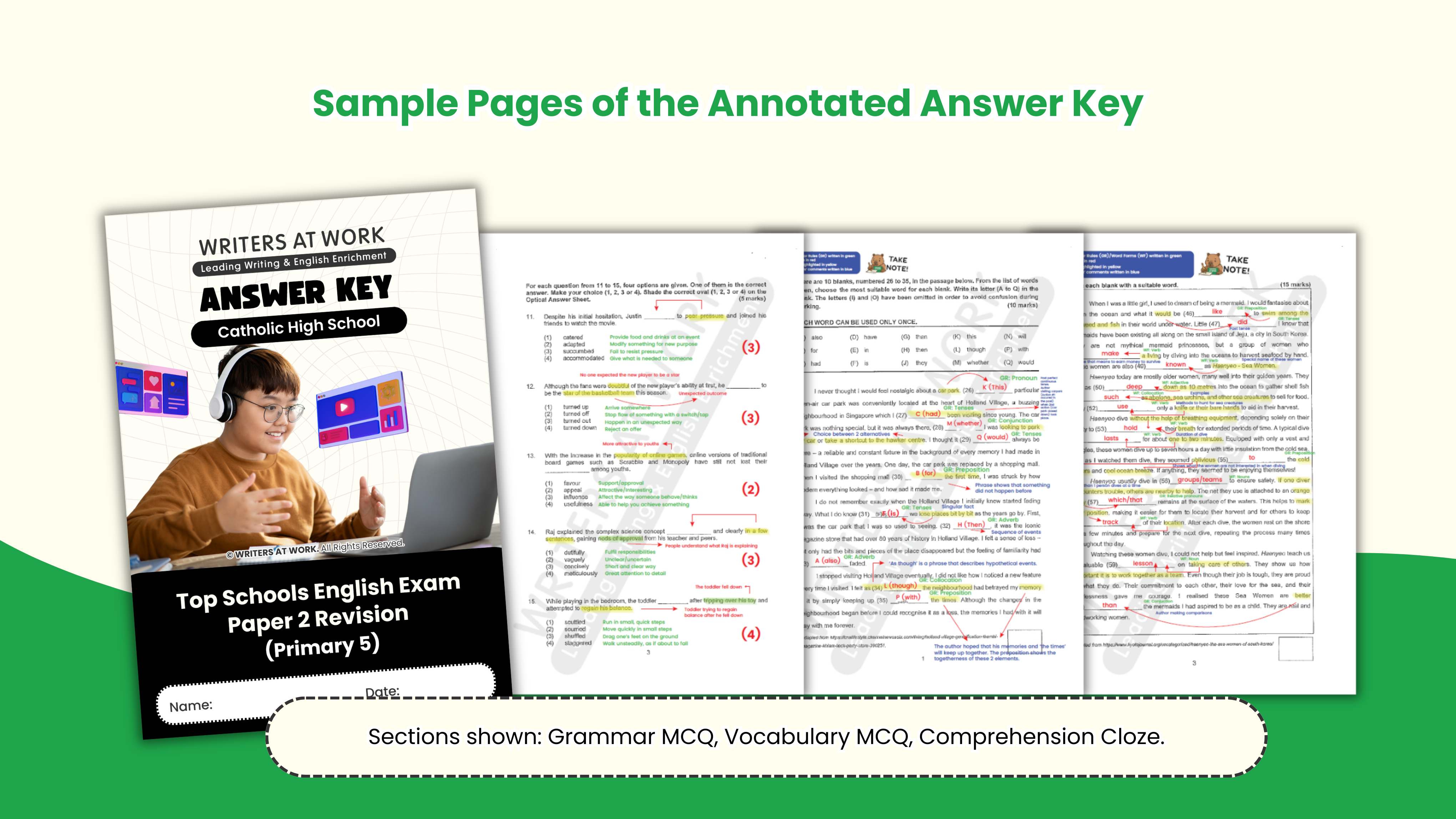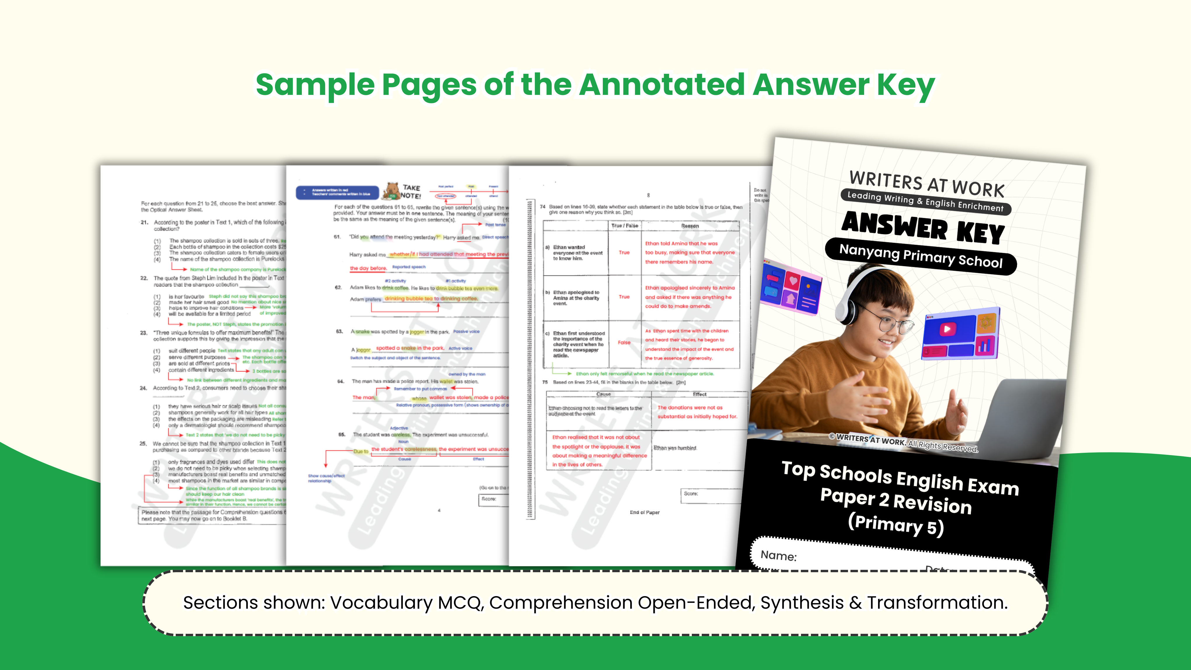 Your child will practise using the actual Primary 5 examination papers from top-performing schools in Singapore and learn from well annotated answer keys done by WRITERS AT WORK Teachers.
