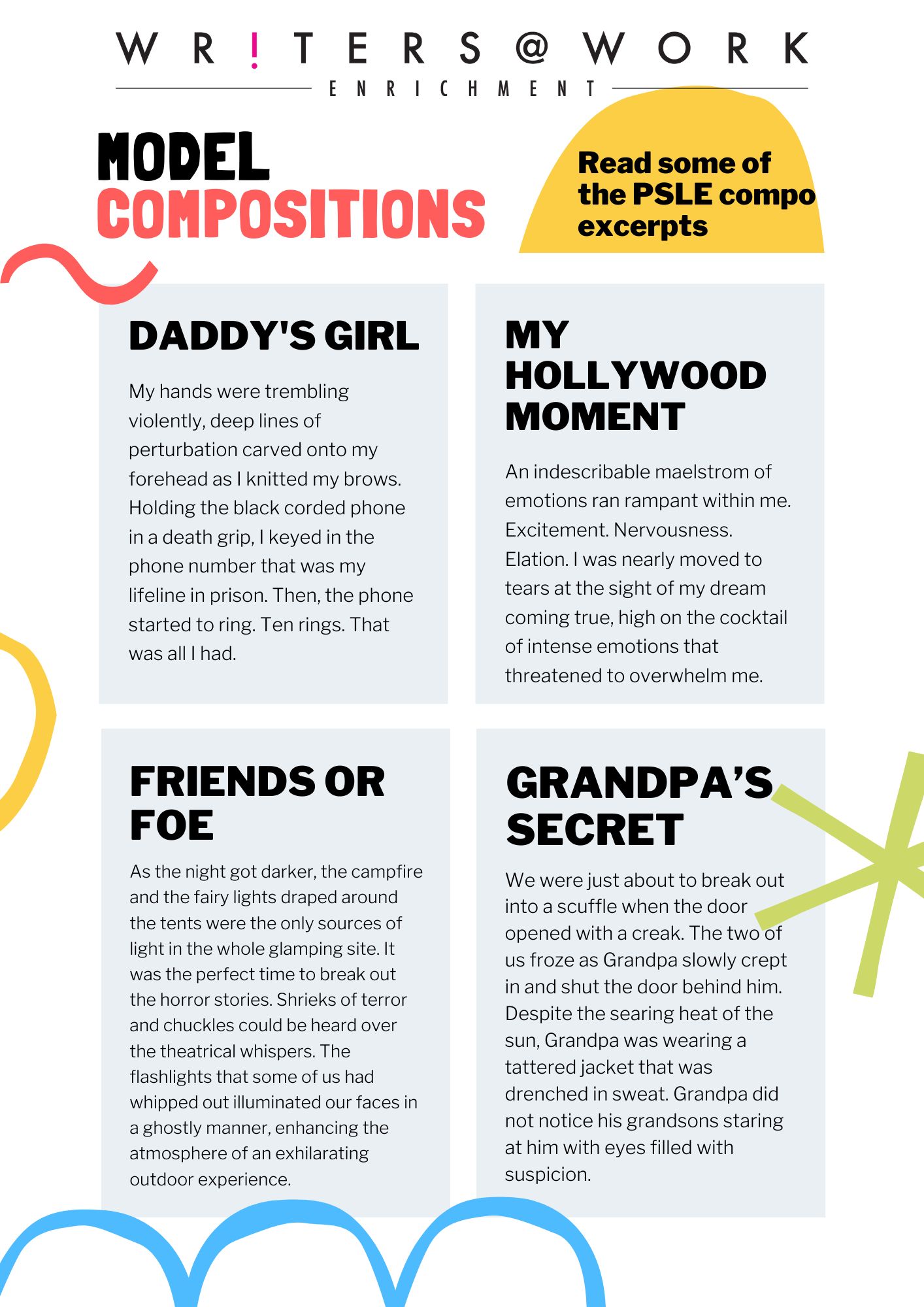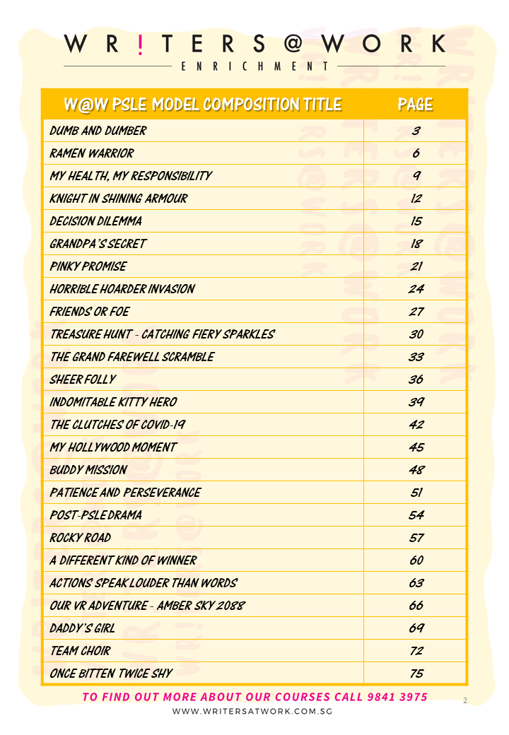 [NEW UPDATES] Get all 25 WRITERS AT WORK Model Compositions in an audio book! Learn and revise all these classic stories by listening to WRITERS AT WORK PSLE Model Compo Audiobook! Students can learn all these AL1 stories during their travelling time or just right before they go to bed. Making easier for PSLE students to revise all these powerful AL1 PSLE stories to prepare for exams!